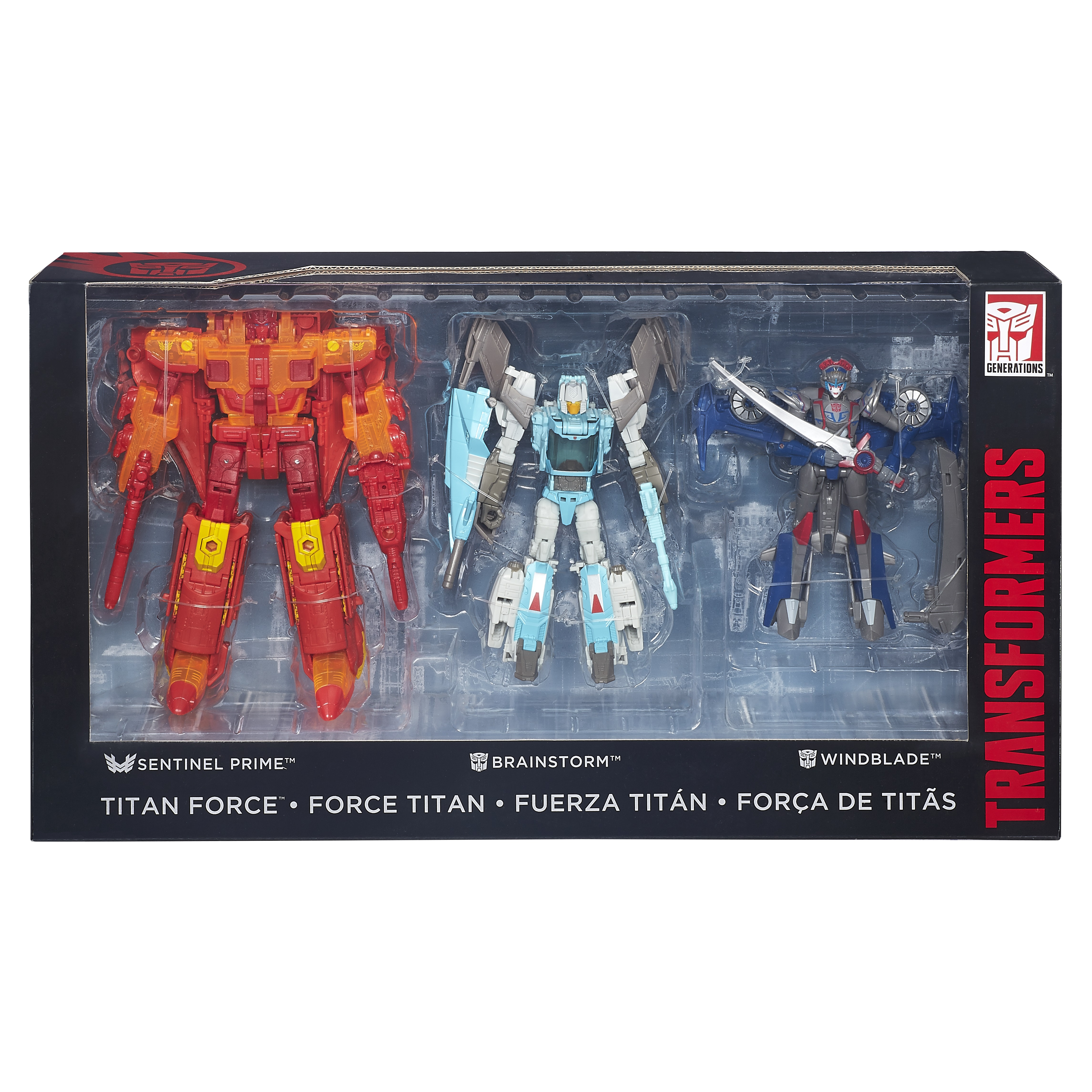 Os fãs de Transformers encontrarão exclusivamente na Loja da Hasbro um produto da Linha Generations que celebra a surpreendente volta do Sentinel Prime a Cybertron. O colecionável Transformers Titan Force (R$ 999,99) vem com uma figura na escala Voyager (aprox. 15 cm) do Sentinel Prime, duas na escala Deluxe (aprox. 13 cm)- Class Brainstorm e Windblade – e duas figuras Titan Master – Autobot Teslor e Autobot Infinitus. A figura do Sentinel Prime, líder dos Autobots, converte em 3 modos: robô, jato espacial e trem. As figuras Brainstorm e Windblade têm duas formas: robô e jato.