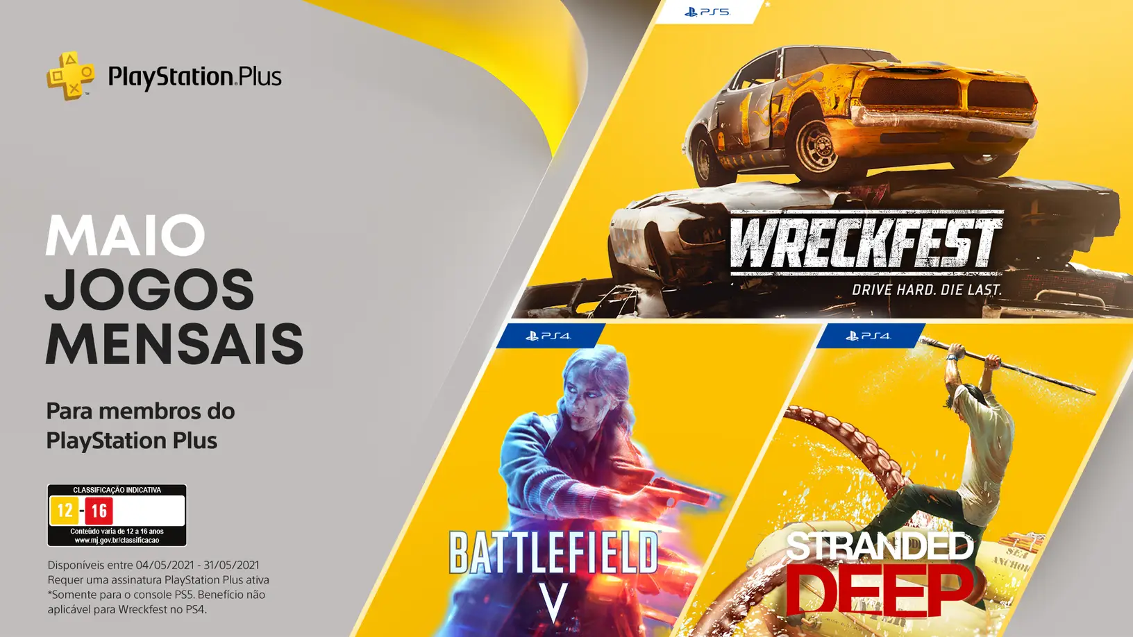Foi anunciado hoje (28) que Battlefield V, Stranded Deep e Wreckfest: Drive Hard. Die Last são os jogos inclusos com a PS Plus em maio. Os títulos poderão ser resgatados pelos assinantes do serviço entre 4 e 31 de maio. Veja, abaixo, mais detalhes de cada jogo: